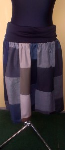 Stoff-Patchkleid-(3)Dann zauberte ich aus dem fertigen Grundmaterial mit Hinzunahme eines schwarzen Baumwolljerseys und eines Veneziafutters einen Rock. Das Bündchen des Stoffes machte ich so lang, dass man es sich gut über dem Bauch drapieren kann und trotz eines dazu getragenen engen schwarzen T-Shirts kleine Pölsterchen ungesehen bleiben. Außerdem hat die Trägerin die Möglichkeit, den Rock auch zum trägerlosen Kleid umzufunktionieren.